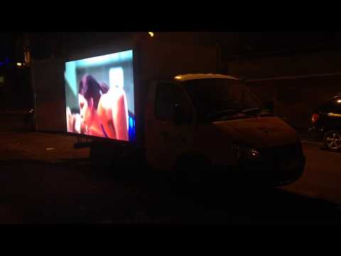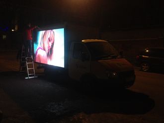 Светодиодный экран устанавливаемый на автомобиль. Данную модель отличает возможность оперативного передвижения, что предоставляет возможность эксплуатации как в качестве стационарной точки, так и во время проведения выездных мероприятий: выставки, фестивали, спортивные мероприятия, концертные площадки и т.д. LED экран может быть установлен практически на любую платформу и собран из матриц различного шага пикселя.
